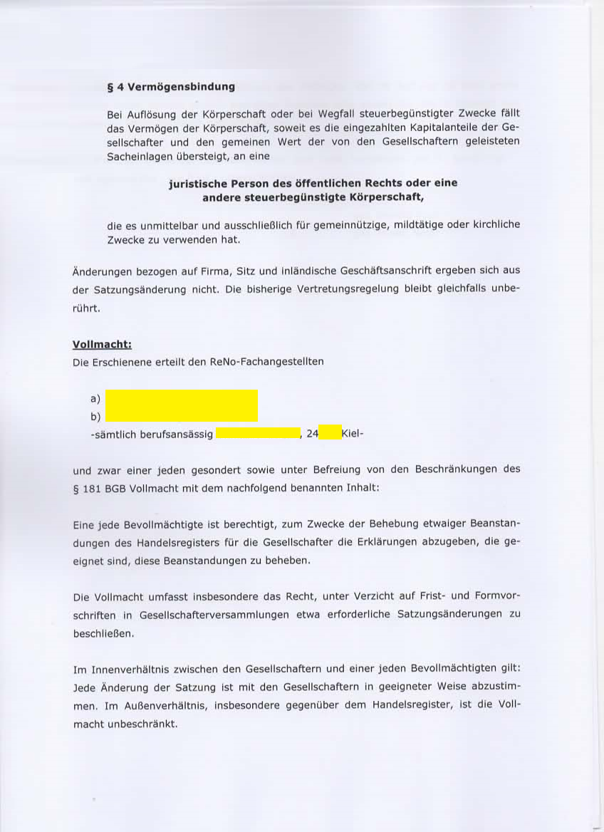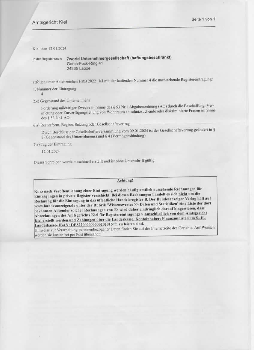 Eintrag ins Handelsregister beim Amtsgericht Kiel,