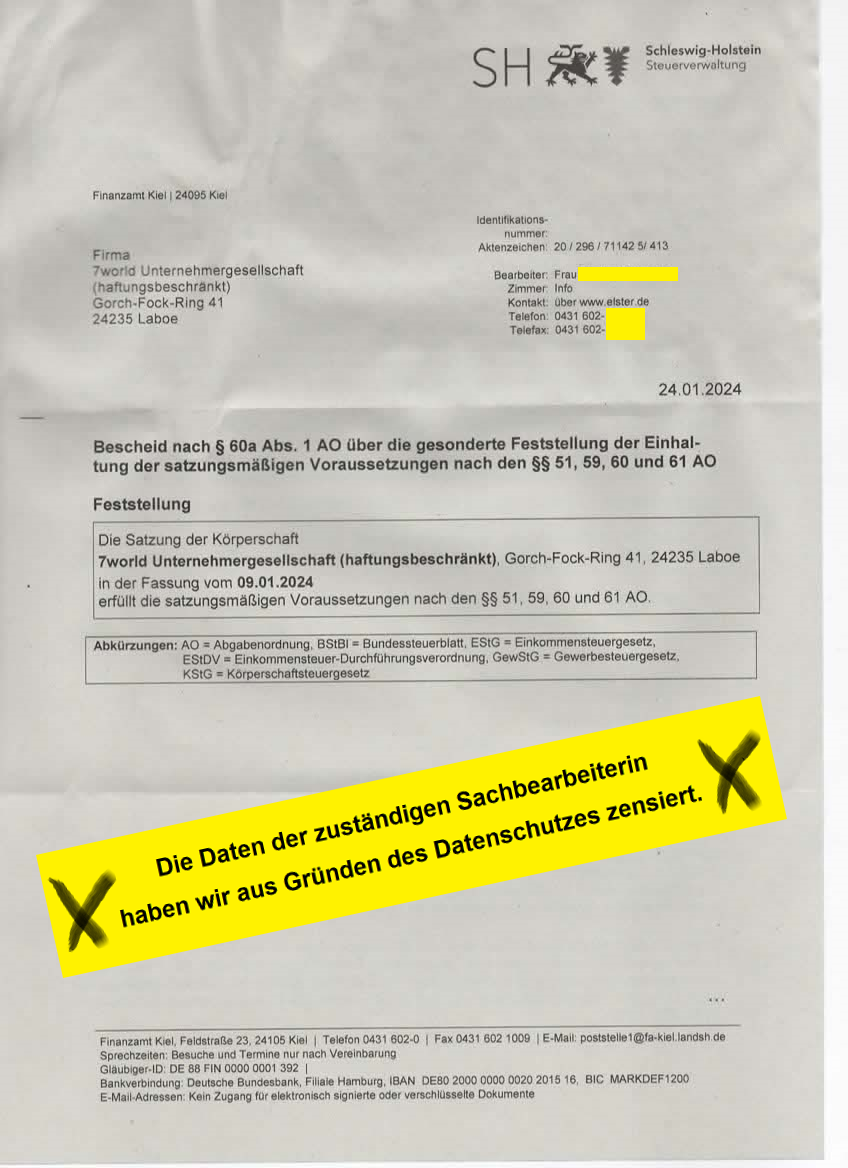 Freistellungsbescheid vom Finanzamt Kiel, Satzung von 7world:
