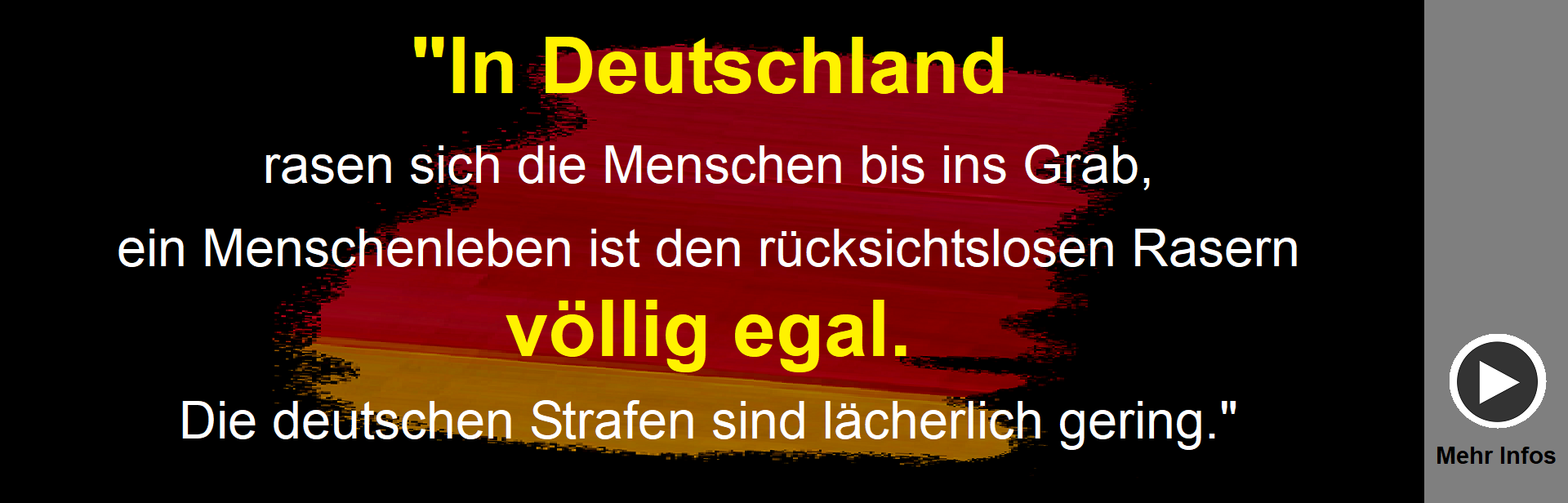 Nach deutschem Verständnis funktioniert die Autoindustrie nur, wenn gestresste und psychisch kranke Menschen mit ihren Autos mit Vollgas durch ihr hektisches Land rasen können. Das hat zur Konsequenz, dass jeden Tag viele Menschen im Straßenverkehr getötet oder verletzt werden. Beim rücksichtslosen Rasen gehen Unfälle fast immer von Männer aus. Mittlerweile gibt es sogar schon Raser-Tourismus, denn immer mehr rücksichtslose Raser kommen mit ihren Autos aus dem benachbarten Ausland, um hier