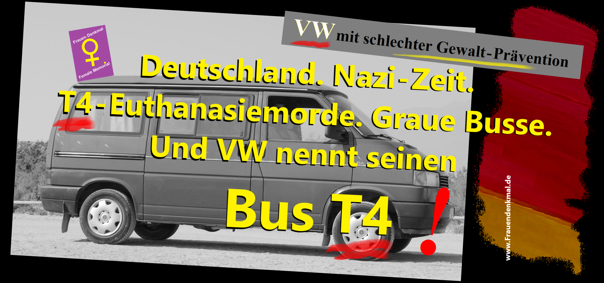 Aber bei VW ist das anders: VW wurde in der Nazi-Zeit gegründet, VW wurde von Adolf Hitler protegiert, in der Nazi-Zeit gab es die Euthanasiemorde, bei denen viele tausend Menschen mit grauen Bussen zu Tötungseinrichtungen gefahren wurden, die Aktion T4. Und in dieser Kombination darf es nicht sein, dass ein weltweit agierender Konzern, mit einer der besten Marketingabteilungen, seinen VW-Bus T4 genannt hat oder nennt.